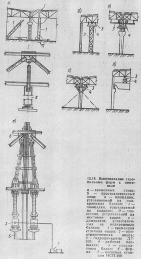 Вывешивание стропильных ферм выполняют с помощью гидравлических домкратов и временных опор (рис. 13.16). Домкраты и временные опоры устанавливают только в узлах ферм. Для предотвращения повреждения элементов ферм в месте опирания узлы усиливают, а в некоторых случаях изменяют конструкцию решетки для создания новых узлов. Узлы переопирания стропильных ферм на временные опоры следует выбирать таким образом, чтобы знаки расчетных усилий в элементах вывешенной фермы не изменились на обратные.