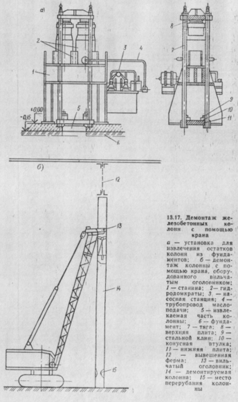 Для выемки корня колонны из стакана фундамента целесообразно применять специальную установку треста Стройгаз Главалтайстроя, в качестве рабочих органов которой использованы гидроагрегаты ДЗГ‑300 (рис. 13.17, а). Верхняя и нижняя плиты станины агрегата соединены четырьмя тягами. При работе с этой установкой вокруг прилегаемой части колонны устраивают паз шириной не менее 150 мм на всю толщину пола и бетонной подготовки (до отметки верха стакана фундамента). Затем с помощью газовой горелки выпрямляют стержни арматуры корня колонны и обрезают их так, чтобы они выступали над плоскостью сруба на 5–7 см. Установку подают краном и устанавливают над стаканом фундамента с таким расчетом, чтобы стержни арматуры вошли в отверстия нижней плиты. После этого их захватывают цанговыми зажимами. Включив двигатель насосной станции, гидродомкратами извлекают корень колонны из стакана фундамента. Если суммарная прочность стержней арматуры на растяжение меньше усилия, необходимого для извлечения корня колонны, следует вырубить бетон замоноличивания колонны в стакане на глубину 129–150 мм. Установка рассчитана на извлечение остатков колонн с глубиной заделки их в стакане до 950 мм, имеющих арматуру диаметром 18–28 мм из стали класса А-Ш. Экономический эффект от ее применения – 588 руб. на один фундамент.