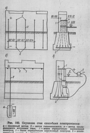 Для устранения капиллярного движения жидкости в стене применяют метод электроосмоса. При этом используют разность электрических потенциалов, возникающих при погружении в электролит, которым является капиллярная влага стены, двух стержней из разных металлов, оказывающихся электродами (рис. 100).