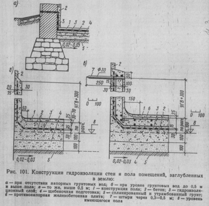 При уровне грунтовых вод до 0,5 м выше пола заглубленного этажа гидроизолирующую конструкцию выполняют в виде обмазки холодной асфальтовой мастикой или оклейки рулонными материалами (рис. 101, б). Гидроизолирующий материал защищают слоем бетона М50 при толщине в зависимости от уровня грунтовых вод над отметкой пола: до 100 м – слой толщиной 30–50 мм, более 300 мм – толщиной – 50–70 мм.