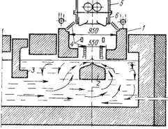 1 — блок; 2 — шамотное тело (поплавок); 3 — противосвильный мост; 4 — холодильник; 5 — машина ВВС; 6 — коробка для улавливания боя стекла