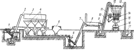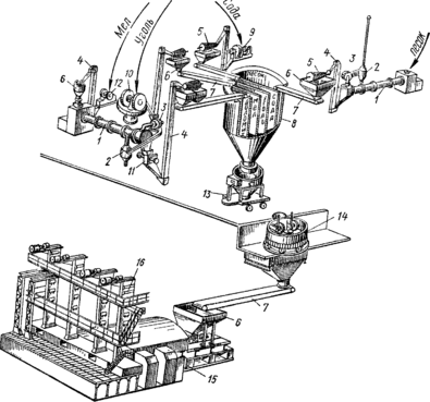 / — сушильный барабан; 2 — циклон; 3 — вентилятор; 4 — элеватор; 5 — сито; 6 — бункер; 7 — транспортер; 8 — секционный бункер (склад сырья — мела, угля, седы и пр.); 9 — дезинтегратор; 10 — бегуны; 11 — молотковая дробилка; 12 — щековая дробилка; 13 — вагонетка-весы; 14 — смешение шихты; 15 — стекловаренная печь; 16 — машина для вытягивания стекла.