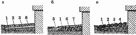 в - булыжная; 1 - материковый грунт; 2 - глина; 3 - песок; 4 - булыжник; 5 - лоток для отвода воды; 6 - щебень или гравий; 7 - бетон; 8 - бетонные плиты.