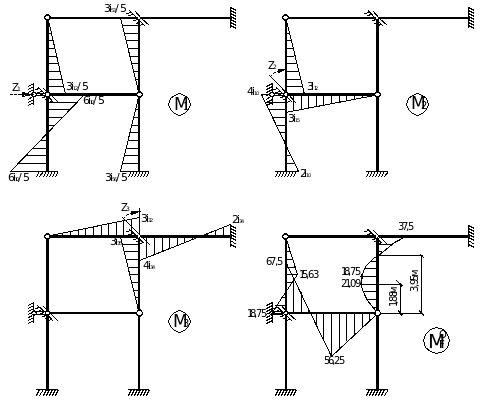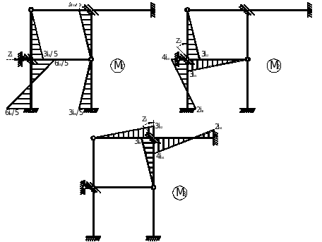 Мал. 26 - Основна система методу переміщень та епюри згинаючих моментів від одиничних переміщень та заданого навантаження в основній системі