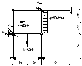 За основні невідомі методу переміщень приймаємо кутові переміщення жорстких вузлів і лінійні переміщення вузлів заданої системи, які позначимо Z1, Z2 i Z3 – кількість невідомих дорівнює ступеню її кінематичної невизначеності: