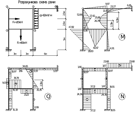 Мал. 25 - Розрахункова схема, епюри внутрішніх зусиль для заданої рами