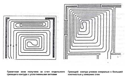 При зигзагообразной укладке горячий теплоноситель поступает в змеевик, как правило, у внешней стены помещения и непрерывно охлаждается при протекании по трубам. Поэтому в месте поступления теплоносителя (начале змеевика) достигается большая температура поверхности и, как следствие, большая теплоотдача. Далее, вглубь помещения, вследствие охлаждения теплоносителя уменьшаются температура поверхности пола и плотность теплового потока. Для достижения достаточной температурной равномерности требуется повысить скорость теплоносителя в змеевике, следовательно, необходимо применение циркуляционного насоса с большей производительностью, чем при аналогичном нагревателе со спиралевидными змеевиками.