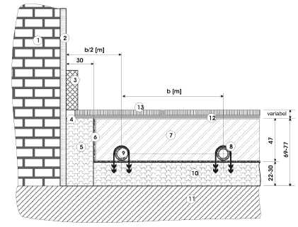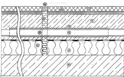 Трубы и электропроводка, которые размещены на несущем настиле, должны быть закреплены. Затем с помощью выравнивающего слоя следует создать плоскую горизонтальную поверхность так, чтобы была возможна укладка теплоизолирующего слоя по всей площади. Для этого следует запланировать требуемую конструкционную высоту. Для выравнивания уровня пола не следует применять сыпучие материалы (как, например, строительные отходы или песок). Если отопительная полоконструкция должна содержать заметные уклоны (>1,5%), например, в душе, то эти уклоны следует изготовить в несущем настиле, чтобы выполнить требование равномерной толщины отепляющего настила. При этом укладка змеевиков должна быть выполнена таким образом, чтобы исключить возможность их завоздушивания.