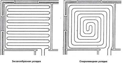 Второй важной особенностью зигзагообразной укладки является возможность ее применения для обогрева наклонных участков (стен), при этом зигзаги должны быть расположены горизонтально перпендикулярно направлению наклона поверхности, а подводящие трубы отходить от зоны змеевика с наивысшим уровнем.