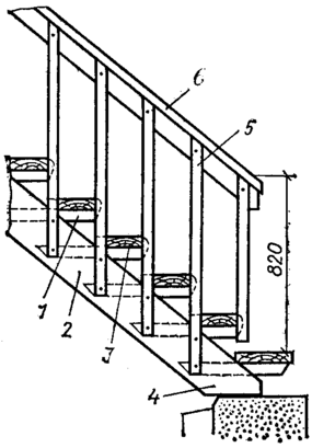 Лестницы со ступенями, установленными на бруски, прибитые к тетивам. Бруски сечением примерно 5x6 см и длиной до 50 см прибивают к внутренней стороне тетив, а на них укладывают дощатые ступени (рис. 6). К наружной стороне тетив привинчивают шурупами стойки перил.