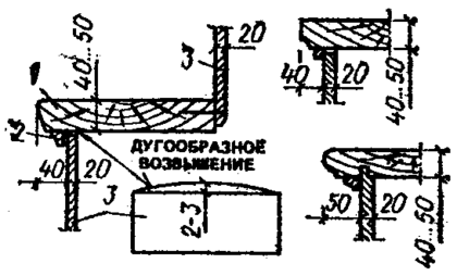 Рис. 3. Способы соединения ступени (проступи) с подступенькой: 1 – проступь; 2 – нащельная рейка; 3 – подступенька