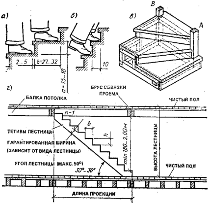 Рис. 2. Фрагменты ступеней: а – высота и ширина нормальной ступени; б – ширина узкого конца ступени винтовой лестницы; в – фрагмент винтовой лестницы; г – разрез лестницы