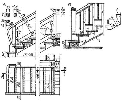 Рис. 5. Лестницы для индивидуальных домов: а – со ступенями, заведенными в вырезы тетив; б – со ступенями, устанавливаемыми в вырезы тетив в накладку