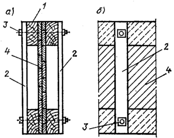 Рис. 9. Фрагменты гвоздевых балок из брусков и досок: а – поперечный разрез; б – вид спереди; 1 – брусок; 2 – ребро; 3 – болты с гайками и шайбами; 4 – дощатая стенка