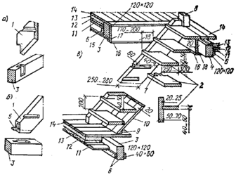 Рис. 4. Дощатая лестница: а, б – соединение наклонных досок (тетив) лестницы с балкой; в – сопряжение проступи с тетивой; 1 – лестничные тетивы; 2 – проступи; 3 – балка; 4 – поперечная балка; 5 – стальной угольник; 6 – рейка; 7 – клин; 8 – стойка; 9 – опорная рейка; 10 – доски; 11 – щит наката; 11 – слой глины; 13 – звукоизоляция; 14 – дощатый пол; 15 – потолок; 16 – рейка; 17 – штукатурка по дранке; 18 – нащельник