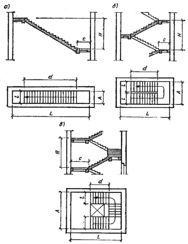 Рис. 1. Схемы лестниц: а – одномаршевая; б – двух маршевая; в – трехмаршевая; I – ширина марша; с – ширина лестничной площадки; А – ширина лестничной клетки; L – длина лестничной клетки: Н – высота этажа; d – длина марша (в горизонтальной проекции)