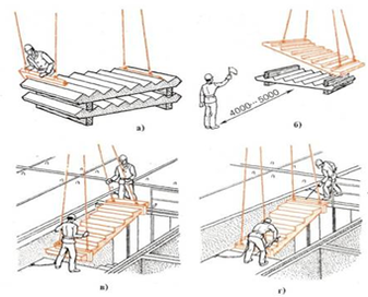 a - строповка вилочным захватом, 6 - подъем, в - прием и опускание, г - установка в проектное положение.