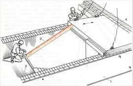 Рис. 12. Укладка плит перекрытия: 1 - плита, 2 - ящик с раствором, 3 - лопата, 4 - ящик с инструментом, 5 - лом