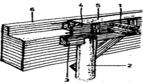 Рис. 17. Укладка сборных железобетонных балок с помощью опорного прогона; 1 — сборная железобетонная балка, 2 — стойка, 3 — прогон, 4 — опалубка, 5 — железобетонный пояс жесткости, 6 — стенка в полкирпича