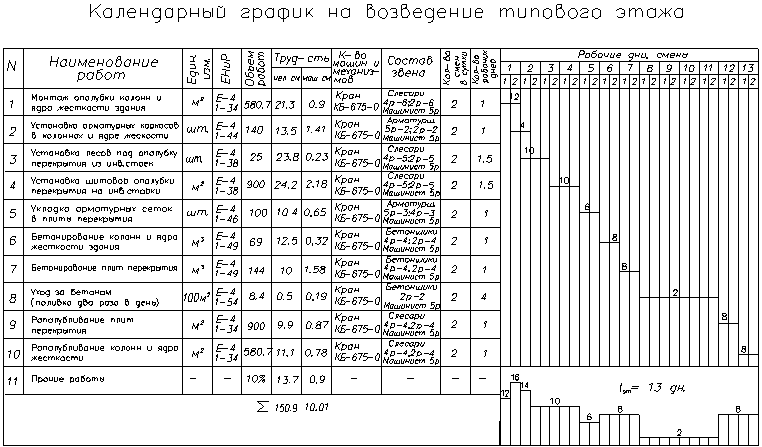 На основе калькуляции трудовых затрат и заработной платы и выбранного варианта производства бетонных работ составляем график производства работ, представленный на рис.5.3.