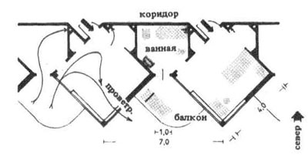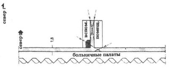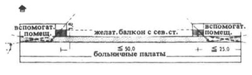 4. Диагонально расположенные палаты, обеспеченные инсоляцией с утра до вечера, с надёжным проветриванием и защищенными от ветра хорошо инсолируемыми балконами с входом из ванной. Площадь палаты около 38,5 м2.