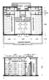 1. Павильон детского дома отдыха на 12 мест. Пища доставляется в готовом виде из кухни, расположенной в главном корпусе. Один воспитатель на 20 детей. Архитектор Вальтер Гропиус. М 1 : 250.
