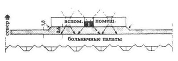 С. Корпус схемы С предполагает одностороннюю застройку коридора и диагональное расположение палат (рис. 4). Лестничная клетка и примыкающие к ней подсобные помещения располагаются центрально, в перпендикулярной к основному корпусу пристройке с двусторонней застройкой коридора, освещенного с северного торца. Подсобные помещения в зависимости от назначения могут быть ориентированы на восток, север или запад. Сосредоточение всех подсобных помещений в специальном коридоре обеспечивает покой в палатах.