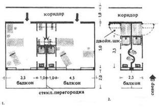А. Палатный корпус схемы А проектируется с односторонней застройкой коридора. Лестницы, лифты, уборные, подсобные помещения и комнаты сестер располагают против палат в концах коридора с освещением с торцов. Веранды, лоджии и балконы для сна и отдыха на воздухе (рис. 1, 2) делают общими или разделяют стеклянными перегородками; балконы иногда ориентируют на север. Поскольку балконы в большинстве случаев уменьшают прямую инсоляцию палат, в современных туберкулезных санаториях устраивают обособленные веранды или террасы, образуемые отступами верхних этажей здания.