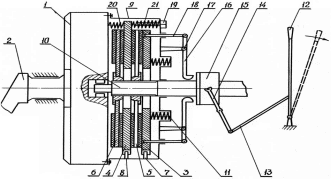 Для выключения сцепления машинист перемещает рычаг 12 на себя, усилие через тягу 13 и вилку включения 14 передается на выжимной подшипник 15, который перемещается к маховику 1 и нажимает на рычаги 16. Последние, поворачиваясь вокруг осей 17, отводят при помощи болтов 18 ведущий нажимной диск 3 от ведомого диска 5, а промежуточный ведущий диск 4 отходит от ведомых дисков 5 и 6 с помощью пружин 20 и 21.
