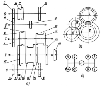 Рис. 10. Коробка передач трактора ДТ-75 М: а – кинематическая схема; б – схема взаимного расположения валов; в – положение рукоятки рычага при включении разных передач