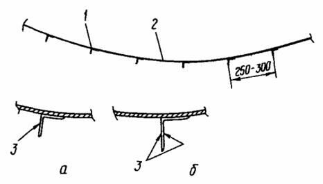 До начала развертывания рулона стенки к днищу резервуара по кольцевой риске приваривают ограничительные уголки с интервалом 250 - 300 мм (черт. 8). В зоне вертикального монтажного стыка на расстоянии 3 м в обе стороны от стыка ограничительные уголки приваривают по окончании формообразования концов полотнищ.