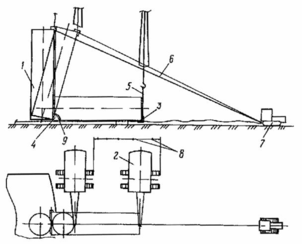 1 - рулон стенки; 2 - кран; 3 - захват для подъема рулона; 4 - шарнир; 5 - грузовой канат; 6 - тормозной канат; 7 - тормозной трактор; 8 - реперы, определяющие этапы перемещения крана; 9 - угловой сектор