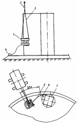 4) крепят стойку в вертикальном положении пятью расчалками с талрепами. На резервуарах объемами 10000 м3 и более расчалки крепят к периферийной части днища на расстоянии не менее 4,5 м от стенки таким образом, чтобы при развертывании рулона расчалки не мешали его перемещению. На резервуарах объемами 5000 м3 и менее расчалки крепят к наземным якорям, расположенным за основанием (фундаментом).