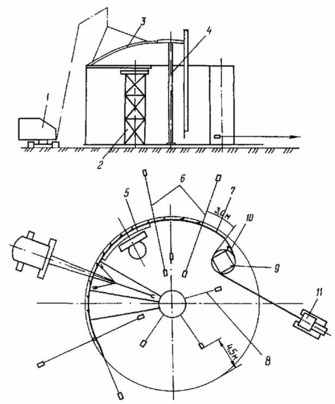 1 - кран; 2 стойка для монтажа опорного кольца; 3 - щит покрытия, 4 - монтажная стойка; 5 - опорное кольцо; 6 - переносные расчалки; 7 - развернутая часть полотнища стенки; 8 - расчалки монтажной стойки; 9 - рулон стенки; 10 - клиновой упор; 11 - трактор