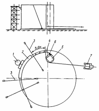 1 - стойка для монтажа кольца жесткости (промежуточных колец); 2 - кольцо жесткости; 3 - переносные расчалки; 4 - развернутая часть полотнища стенки; 5 - рулон стенки; 6 - клиновой упор; 7 - трактор