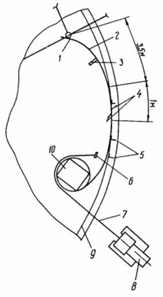 1 - труба жесткости; 2 - начальный участок полотнища стенки; 3 - упор; 4 - прихватка стенки к днищу; 5 - ограничительные уголки; 6 - скоба; 7 - удерживающий канат; 8 - трактор; 9 - риски для приварки ограничительных уголков; 10 - рулон стенки