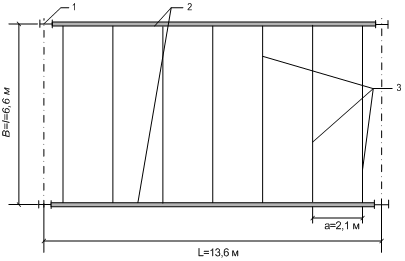 Рис. Схема балочной клетки нормального типа: 1 – колонна; 2 – главные балки; 3 – балки настила