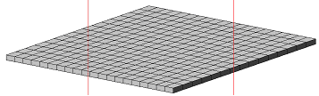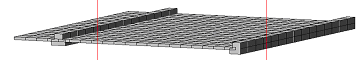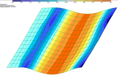 Конечно-элементная модель фрагмента перекрытия (рис.4) собрана путем интерактивного ввода параметров несущих конструкций. Пространственная система состоит из пластин соответствующей толщины (см.рис.2) – плит перекрытия – и стержней – ригелей. Размер конечного элемента пластин принят 0,4м в продольном направлении (вдоль цифровых осей) и 0,6м в поперечном направлении (вдоль буквенных осей).