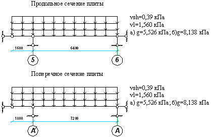 Рисунок 3. Расчётная схема фрагмента плиты перекрытия: постоянная нагрузка а – для сборного варианта, б – для монолитного