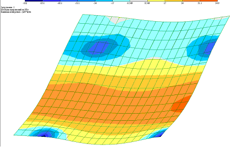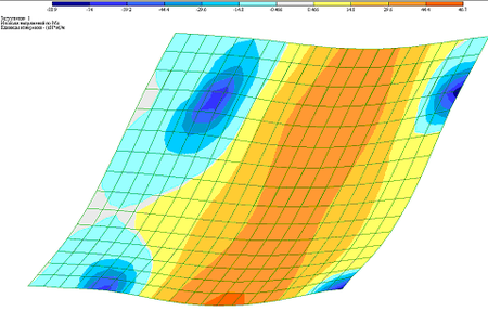 Удобно изополя анализировать, разделив ячейку перекрытия на полосы шириной 1м: две пролётные, проходящие по центру, и четыре надколонные. С учётом этого выпишем значения изгибающих моментов в наиболее нагруженных конечных элементах плиты перекрытия и сведём значения в таблицу: