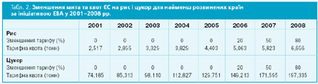 Для найменш розвинених країн з 2001р. ЄС запропонував нову ініціативу "Все, крім зброї" (Everything But Arms - EBA), яка передбачає вільний доступ на ринки Союзу всіх товарів без мита та квот, окрім свіжих бананів, рису і цукру, ринки яких відкриваються поступово (див. табл.2).
