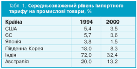 По-перше, рівень єдиного митного тарифу ЄС постійно знижується на підставі домовленостей у межах раундів переговорів ГАТТ/СОТ (див. табл.1). Окремі товари (масляничне насіння, корм для худоби, мінеральні продукти - окрім палива, дерево, гума) обкладаються імпортними зборами замість мита.