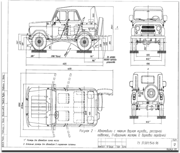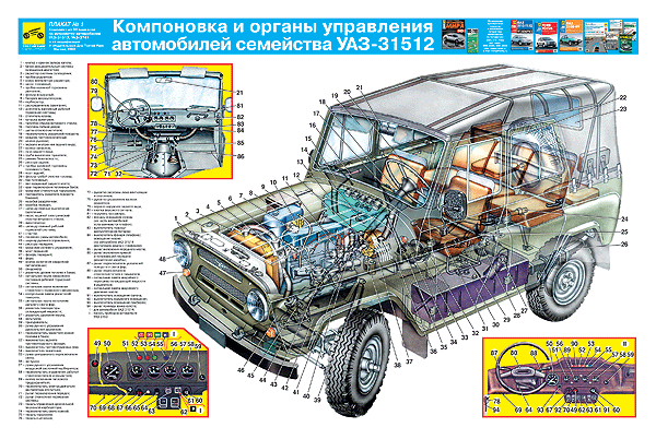 из книги Э.Н. Орлова и Е.Р. Варченко "Автомобили УАЗ" техническое обслуживание и ремонт Первые полноприводные автомобили ГАЗ-69 и ГАЗ-69А повышенной проходимости Ульяновский автомобильный завод начал выпускать в 1954 г. ГАЗ-69 - это грузопассажирский автомобиль с колесной формулой 4х4 для перевозки людей и грузов по всем видам дорог и бездорожью. Автомобиль рамной конструкции, классической компоновки (с передним расположением двигателя) с цельнометаллическим двухдверным кузовом, восьмиместный с продольным расположением задних сидений. Кузов закрыт тентом из прорезиненной ткани. Для работы в зимних условиях в автомобиле предусмотрен отопитель. Автомобиль может буксировать прицеп полной массой до 850 кг. Автомобиль ГАЗ-69А отличается от автомобиля ГАЗ-69 только тем, что имеет четырехдверный кузов, поперечное расположение заднего трехместного сиденья и предназначен для перевозки 5 чел. и 50 кг груза в багажнике. Простота конструкции, удобство обслуживания, надежность в эксплуатации и универсальность позволили этим автомобилям очень быстро завоевать признание на отечественном и международном рынке. В 1958 г. завод освоил новое семейство автомобилей УАЗ-450 повышенной проходимости (фургон, санитарный автомобиль и грузовик). При их создании основные узлы шасси были использованы от автомобиля ГАЗ-69, но компоновка этих автомобилей была оригинальной, в дальнейшем получившая название вагонной. Рабочее место водителя и место пассажира были размещены над передними колесами, что позволило увеличить объем закрытого цельнометаллического кузова до 5 м3, а применение усиленной подвески и новых более мощных шин (8,40-15) позволило поднять грузоподъемность этих автомобилей. При всех достоинствах автомобили ГАЗ-69 и УАЗ-450 имели и недостатки: не хватало мощности двигателя, а форсировать его по частоте вращения коленчатого вала и степени сжатия не позволяло нижнее расположение привода клапанов; рама была технологически сложная и недостаточно прочная; были недоработки у трехскоростной коробки передач, рычажных амортизаторов и других узлов. В 1966 г. завод освоил новое семейство автомобилей УАЗ-452 вагонной компоновки (фургон, санитарный автомобиль, грузовик и автобус). Эти автомобили, сохранив внешние формы автомобилей УАЗ-450 (с небольшими изменениями), были спроектированы на новых более надежных и совершенных узлах: верхнеклапанном четырехцилиндровом двигателе мощностью 51,5 кВт, усиленном сцеплении, новом рулевом управлении и четырехступенчатой коробке передач, новой раздаточной коробке, ведущих мостах с четырехсателлитными дифференциалами, новой раме, подвеске и других узлах. Кроме того, была сделана боковая дверь кузова. Грузоподъемность этих автомобилей повысилась до 800 кг, а максимальная скорость до 95 км/ч. На этих новых узлах был спроектирован и в 1972 г. поставлен на производство новый джип - УАЗ-469Б. Завод постоянно совершенствует свои автомобили, уделяя особое внимание повышению их надежности и долговечности, улучшению их активной и пассивной безопасности, снижению расхода топлива и повышению комфортности для водителя и пассажиров. И хотя внешне автомобили изменились незначительно, конструкция многих узлов и систем, а также технические характеристики автомобилей улучшены значительно. Так, за последние годы на автомобили устанавливаются: 