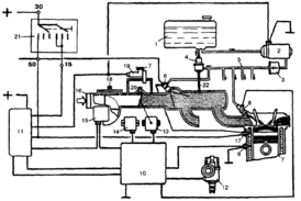 1 — топливный бак, 2 — топливный насос, 3 — фильтр тонкой очистки топлива, 4 — регулятор давления топлива в системе, 5 — распределительная магистраль, 6 — пусковая форсунка, 7 — блок цилиндров двигателя, 8 — форсунка (инжектор) впрыска, 9 — датчик температуры охлаждающей жидкости, 10 — электронный блок управления, 11 — блок реле, 12 — датчик-распределитель зажигания, 13 — выключатель положения дроссельной заслонки, 14 — высотный корректор, 15 — расходомер воздуха, 16 — подвод воздуха, 17 — термореле, 18 — винт качества (состава) смеси на холостом ходу, 19 — клапан добавочного воздуха, 20 — винт количества смеси на холостом ходу, 21 — выключатель зажигания, 22 — подвод разрежения к регулятору давления топлива в системе