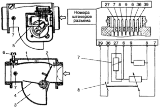 1 — обводной канал, 2 — измерительная заслонка, 3 — демпферная камера, 4 — пластина демпфера, 5 — потенциометр, 6 — винт качества (состава) смеси холостого хода, 7 — датчик температуры, 8 — контакты топливного насоса