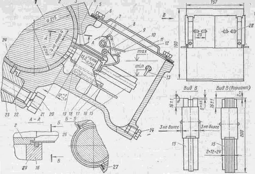 Тяговый редуктор защищен кожухом. Нижняя 2 и верхняя 3 половины кожуха скреплены между собой по лапам через дистанционные прокладки 9 четырьмя болтами 8 с корончатыми гайками 10 и крепятся к тяговому электродвигателю тремя болтами 11. Момент затяжки болтов 8 должен быть в пределах 245+49 Н * м (25+5 кгс * м), а болтов 11 - 1570+196 H * м (1604"20 кгс • м). На обечайке верхней половины кожуха размещен сапун 5, а нижней половины - заливная горловина с пробкой 1. Уплотнением пробки служит резиновая прокладка. Нижняя кромка отверстия горловины является верхним уровнем смазки в кожухе. По разъему верхней половине приварены разновысокие накладки: наружные 17-фасонные и внутренние 20-плоские, между ними уложена резиновая трубка 18 и заложена смазка.