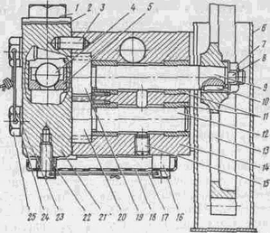 Снимите крышку 20 (см. рис. 8), отсоедините шестеренный насос, снимите сетку 18 (рис. 12). Расшплинтуйте и выверните болты 25. Снимите кожух б, шестерню 13, отсоедините клапанную коробку 21 от корпуса 14. Очистите, промойте и осмотрите все детали. Про верьте корпус насоса и клапанную коробку на наличие трещин, при необходимости замените. Осмотрите шестерни насоса, при наличии сколов и трещин в зубьях замените. Проверьте суммарный торцовый зазор между торцами шестерен насоса и торцом клапанной коробки с помощью свинцовой пластины, устанавливаемой между клапанной коробкой и торцами шестерен. Разрешается восстановление до чертежного размера путем пришабровки торца клапанной коробки к корпусу насоса, при этом плотность прилегания по краске должна быть не менее 90%. Проверьте радиальный зазор между зубчатыми венцами шестерен насоса и его корпусом, допускается восстановление до чертежного размера путем нанесения полуды на корпус насоса. Проверьте диаметральный зазор между валиками шестерен и бронзовыми втулками, при наличии овальности валиков допускается их шлифовка. Втулки, ослабшие в посадке в корпусе насоса, а также изношенные по внутреннему диаметру, замените новыми. Запрессуйте втулки в корпус насоса с натягом 0,005-0,095 мм, после чего произведите развертку их внутреннего диаметра. Осмотрите шестерни привода насоса, при наличии изломов или трещин в зубьях, вмятин на поверхности каждого зуба площадью более 50 мм2 и глубиной более 0,4 мм, износа по толщине зубьев более 2,0 мм, покрытия более 25% поверхности коррозийными язвами шестерни замените.