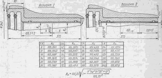 Остучите легкими ударами молотка по нерабочей поверхности вкладыши моторно-осевых подшипников, при обнаружении трещин замените комплектно и расточите. Профиль расточки рабочих поверхностей вкладышей приведен на рис. 13, вариант 1. При отсутствии в депо необходимой оснастки допускается расточка вкладышей по варианту 2. Выпуск из ремонта колесно-моторных блоков с вкладышами, имеющими расточку, не соответствующую приведенной на рисунке, не допускается. Осмотрите состояние уплотнений вкладышей и при необходимости замените войлок.