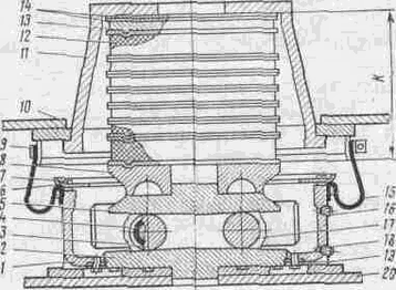 Разборка опорно-возвращающего устройства. Отверните болты 7 (рис. 14). Снимите крышку 6, резинометаллические элементы 12, опоры 8, 5, обойму 17 вместе с роликами 3. Отверните болты 19 и отсоедините опору 2 от корпуса 1.