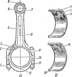 а - шатун двигателя автомобиля ГАЗ-53А; б - шатунные вкладыши; 1 - гайка; 2 - болт; 3 и 14 - отверстия для масла; 4 - стержень шатуна; 5 - бронзовая втулка; 6 - отверстие для подачи масла к поршневому пальцу; 7 - верхняя головка шатуна; 8 - номер шатуна; 9 - нижняя головка шатуна; 10 - крышка нижней головки шатуна; 11 - стопорная шайба; 12 - метка; 13 - усик; 15 - верхний вкладыш; 16 - нижний вкладыш